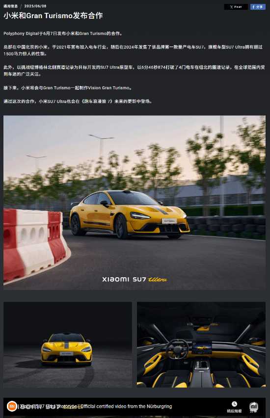 此次预告的悬念背后,是一场酝酿已久的技术共鸣。早在2025年伦敦举办的Gran Turismo世界系列赛揭幕战上,开发商Polyphony Digital便正式宣布与小米达成战略合作,明确小米SU7 Ultra将成为首款收录于《GT赛车》系列的中国车型。这一合作的缘起,始于山内一典亲赴北京小米汽车超级工厂的深度试驾。作为兼具资深赛车手与游戏设计师双重身份的行业标杆,山内一典对性能车有着严苛的甄选标准:“必须是在汽车发展史上留下印记、兼具技术突破与设计美感,且能让我由衷欣赏的作品”。而小米SU7 Ultra以量产车身份创下6分46秒874的纽北四门车圈速纪录的表现,以及27200rpm自研超级电机、0.19Cd超低风阻系数等核心技术参数,恰好与《GT赛车》“用科技还原驾驶本质”的理念不谋而合,成为其叩开虚拟赛道大门的关键密钥。